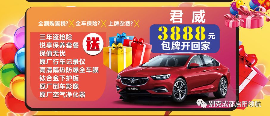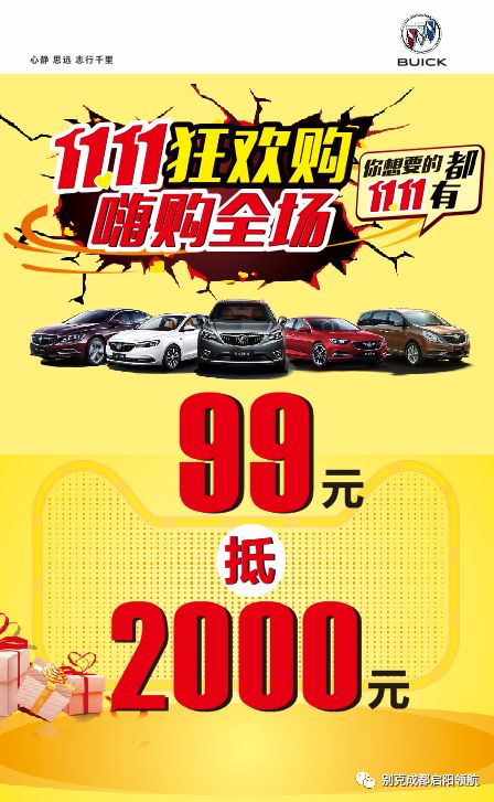 盼望着 盼望着 双11终于来了 我们知道你不想听我们说太多废话 我们知道你想要的是什么 所以,废话不多说 来点实际的! 双11到处是活动 如果优惠力度不够 我们根本不敢拿出来 所以要做活动就做 绝无仅有的优惠 一年就一次,错过请等明年 启阳别克双11狂欢购! 钜惠伴您嗨翻天!!! 2888元英朗包牌开回家! 3888元君威包牌开回家!! 4888元昂科威包牌开回家!!! 【最高优惠】 一年一次大力回馈,机会难得; 【最强阵容】 全系车型现车特供,厂家福利!卖一台少一台!!!; 【诚意礼相送】 现交99元即可享有活动当天翻20倍的膨胀金! 【到店礼相送】 到店即送别克精美礼品一份(数量有限,送完为止)。 【抢订礼相送】 活动当日,订车前10名客户可依次获得豪华订车大礼,先订先得! 【幸运礼相送】 活动当日,凡订车客户都可参与幸运抽奖活动,100%中奖,不来真的会后悔哦! 【互动礼相送】 活动当日现场让您吃饱喝足,参与亲子DIY、互动问答等还有礼品相送。 最重要的是 提前报名 99元抢2000元购车券 畅享20倍膨胀金! 全年仅此一次的巅峰让利 让你一次省更多! 血拼双11 让你爽翻天!